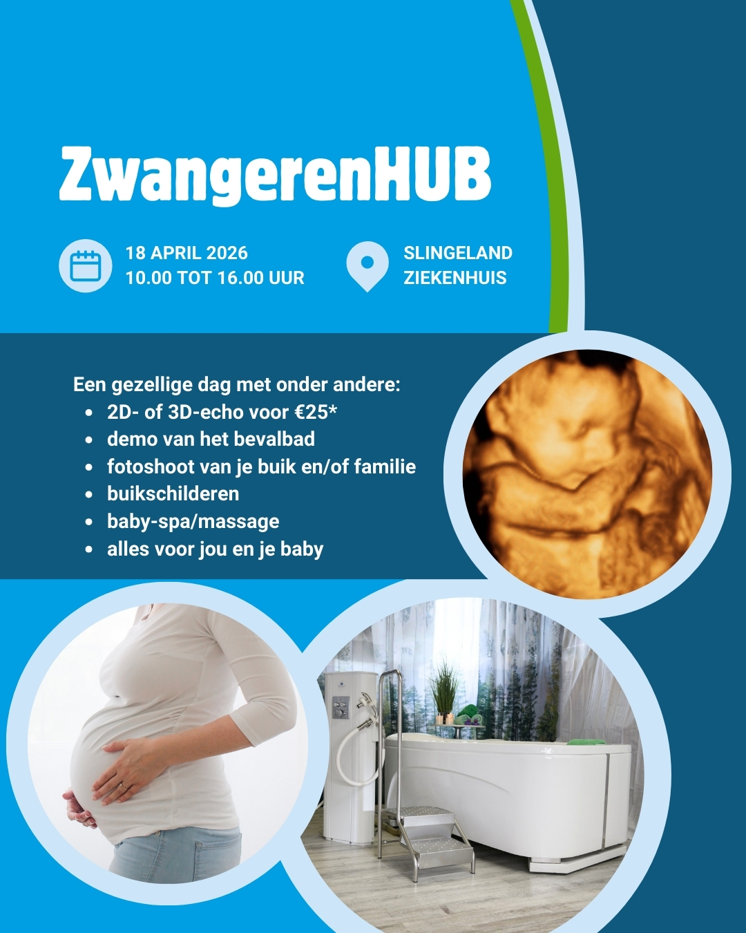 Op zaterdag 18 april heten we je van harte welkom bij de ZwangerenHUB, waarmee we samen geld inzamelen voor een bevalbad in het nieuwe Slingeland Ziekenhuis.